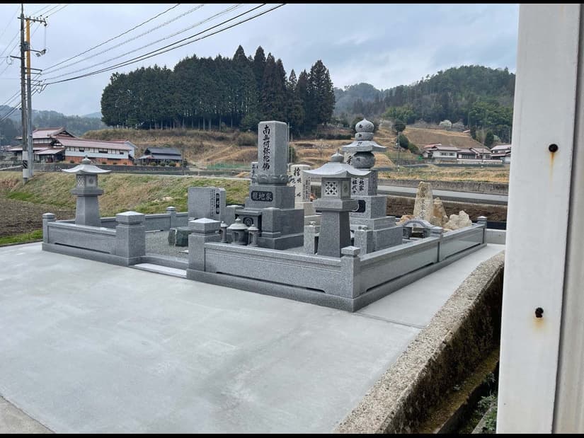 既存墓と新墓と玉垣を据付し墓地内は防草工事外側は犬走で仕上げる