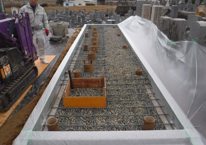 お客様と図面の確認をえて墓石の配置を決め基礎工事をする